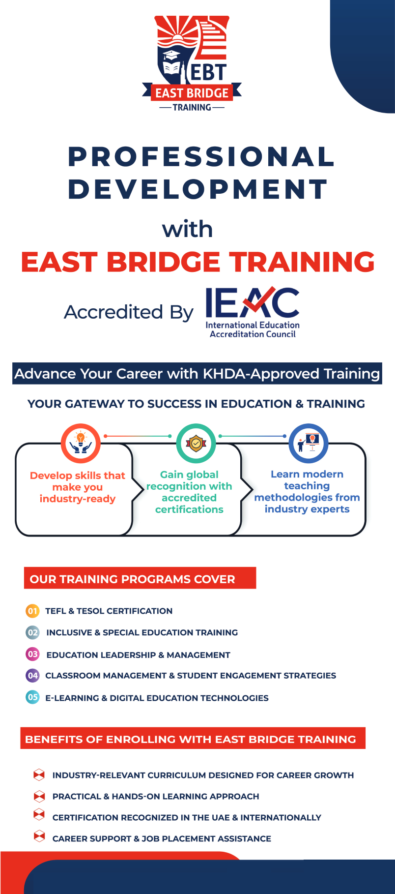 Collectively, our KHDA, IEAC (UK), and EDU accreditations constitute a formidable cornerstone of confidence, quality, and international pertinence. They confirm the standing of EBT as an authoritative training supplier within the UAE and internationally and bestow confidence and qualifications on our learners to compete in an educated and governed educational market.